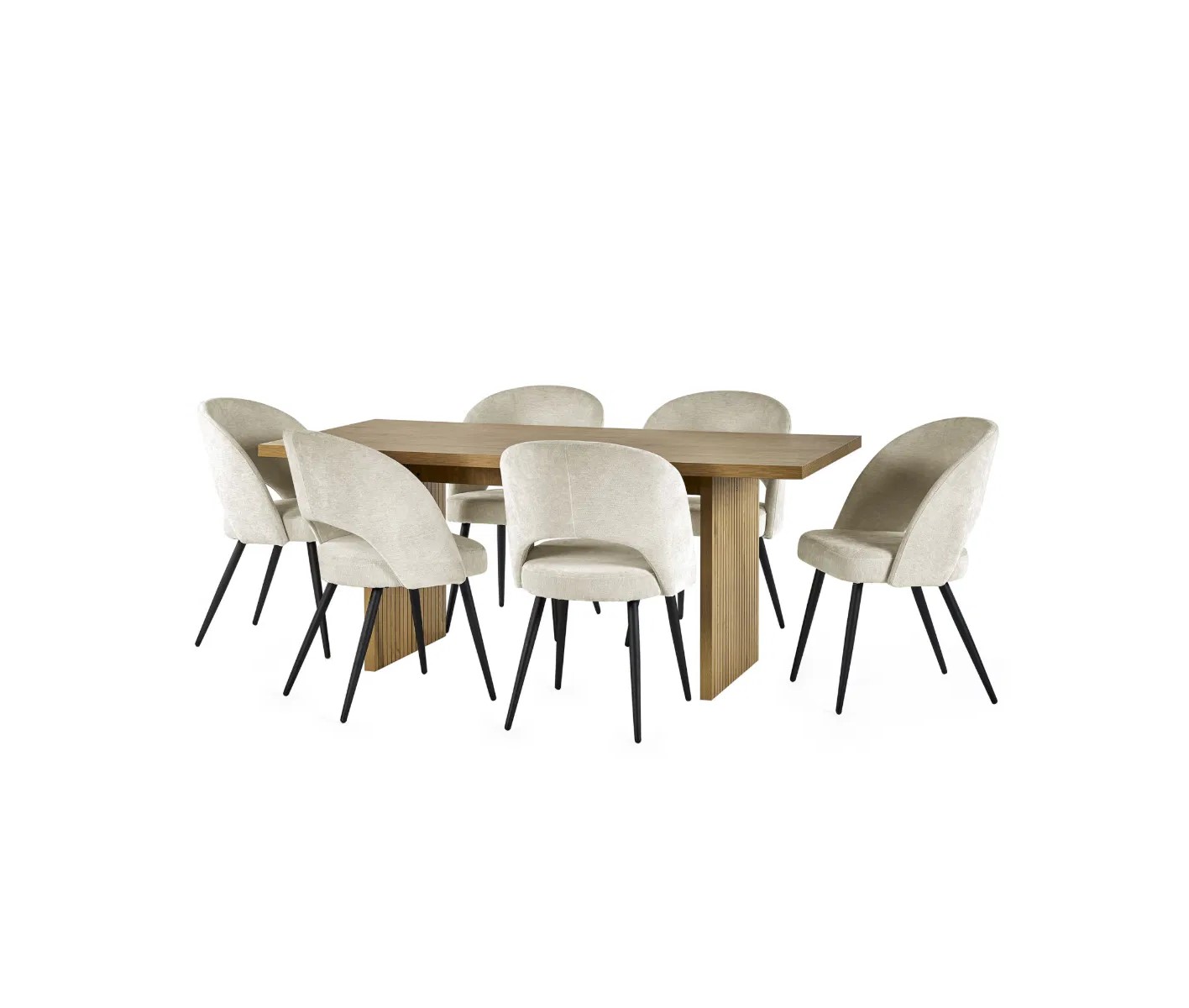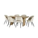 Dine in style with this bold rectangular table that brings a fresh, modern feel to your space. The light oak effect finish adds warmth, while the wide slatted legs are accented with slim black lines for a touch of contrast and character. complemented with 6 exquisite chairs, finished in a sumptuous calico cream, offer a blend of modern sophistication and unparalleled comfort. The gracefully curved high backrest ensures exceptional support.