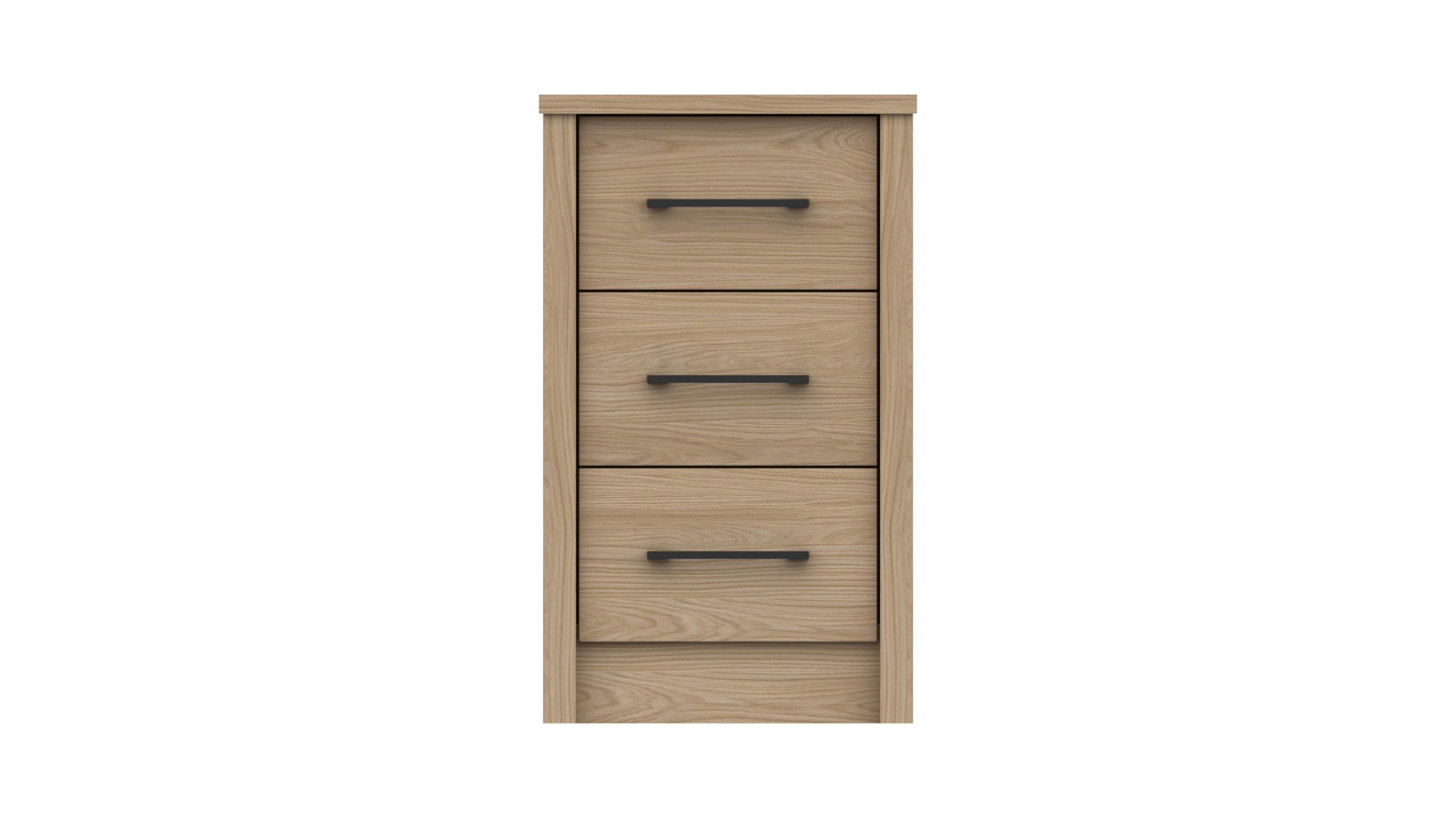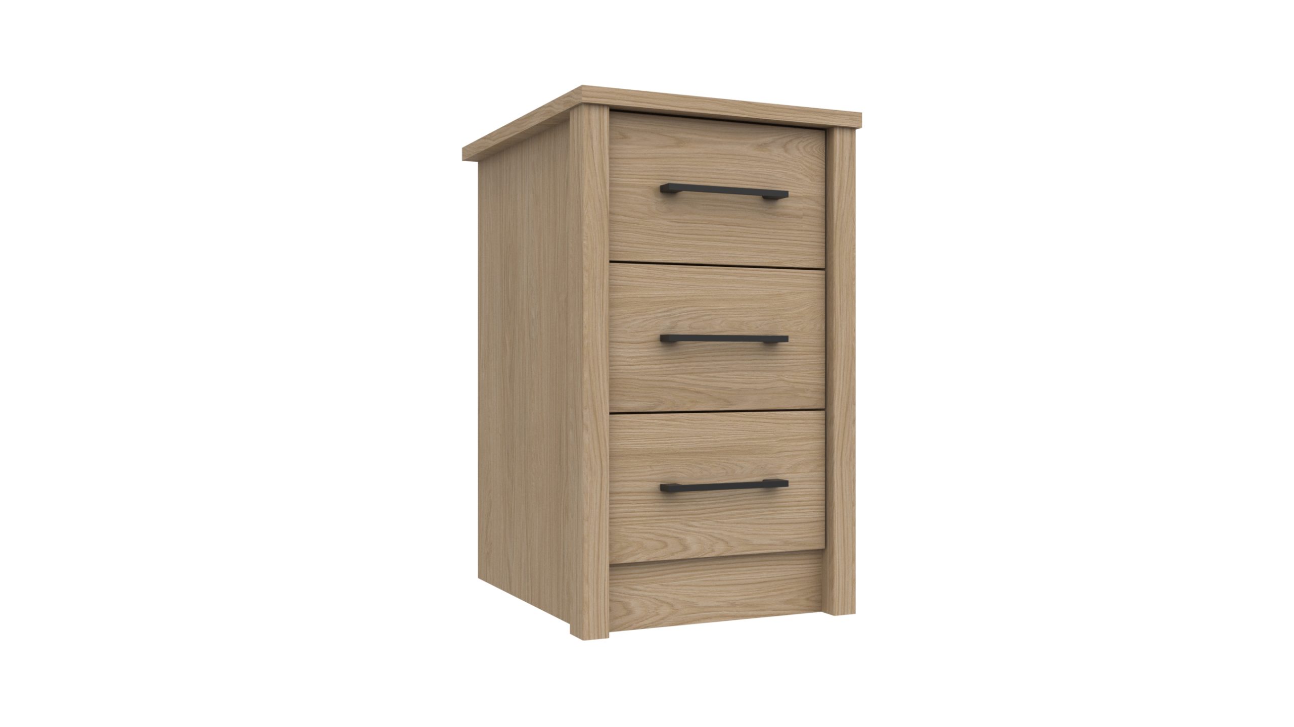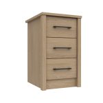 Complete your bedroom with this stylish oak 3 drawer bedside table, designed to combine practical storage with timeless appeal. Featuring a tactile oak carcass and matching oak fronts, this bedside cabinet brings warmth and natural character to both modern and classic bedroom spaces. The distinctive square pillar detailing and sleek black bar handles add a contemporary finish.