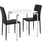 Contrasting dining set to brighten up those dull spaces. The table is in a white laquered table top with chrome legs and the chairs are finished in a soft tactile faux leather with contrasting legs.