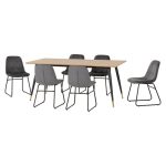 The Hamilton features an timeless oak designed table top on black and gold legs and is complemented with 6 comfortable grey velvet chairs.