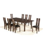 Perfect for family gatherings and unexpected guests the Michigan dining set seats 6 people when closed and up to 10 people with its 2 extensions are added. The table is made of high quality walnut and is complemented with 8 modern wooden chairs dark brown upholstered seat pad.
