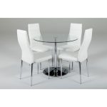 Round glass dining table with stylish chrome base. Comes with 4 PU chairs in white or black